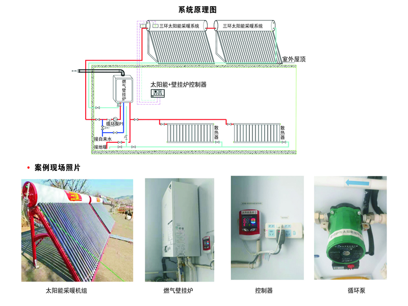 2臺58*1800-30支太陽能采暖專用機、20kW采暖專用壁掛爐、6m揚程太陽能循環(huán)泵、采暖末端(600型-18柱暖氣片兩組)、專用熱水循環(huán)管路及自動控制系統(tǒng)。