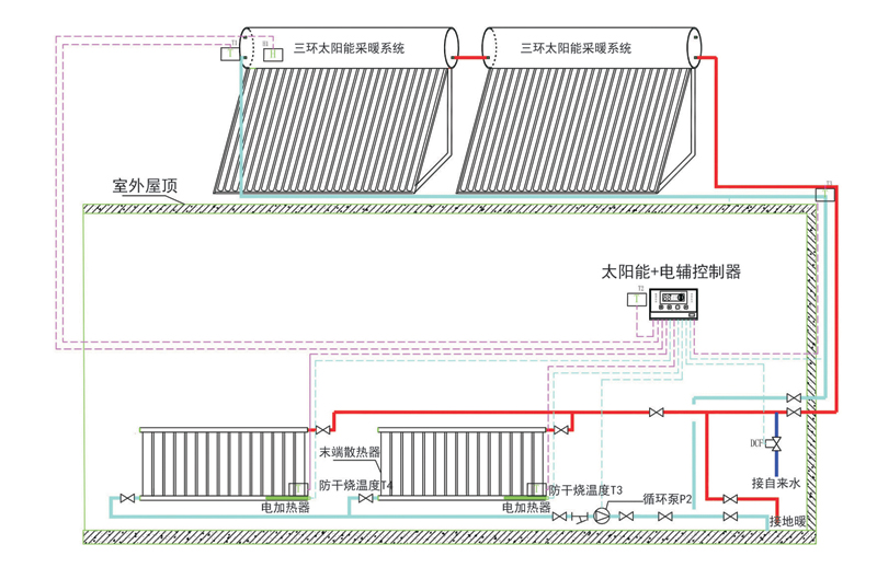 本系統(tǒng)采用3組(或2組)30支太陽能采暖機組,通過吸收太陽能輻射能量將儲水箱內(nèi)的水加熱,當太陽能溫度達到采暖設定值(默認值:45℃),啟動循環(huán)水泵將熱量運送到室內(nèi)采暖末端(暖氣片或地暖),當室內(nèi)溫度達到設定溫度(默認值:16℃)或太陽能水箱溫度低于采暖設定溫度時循環(huán)泵停止,該系統(tǒng)以太陽能熱量采暖為主,電加熱為輔的工作模式,遙控操作使用方便。優(yōu)先使用太陽能熱量,當太陽能溫度不夠時自動切換到電輔加熱模式,太陽能溫度恢復后,自動切換到太陽能供暖模式。