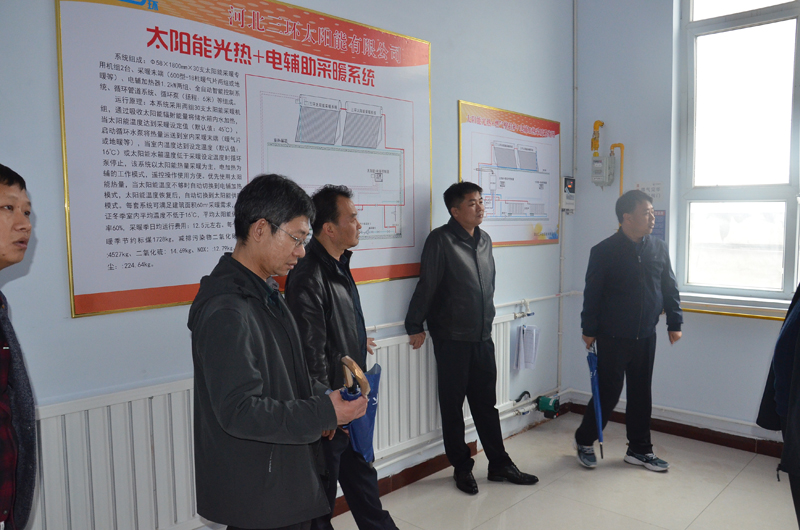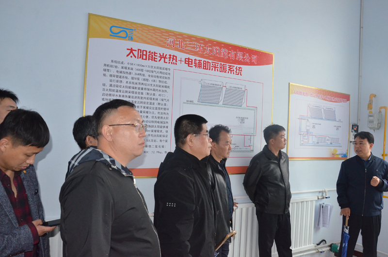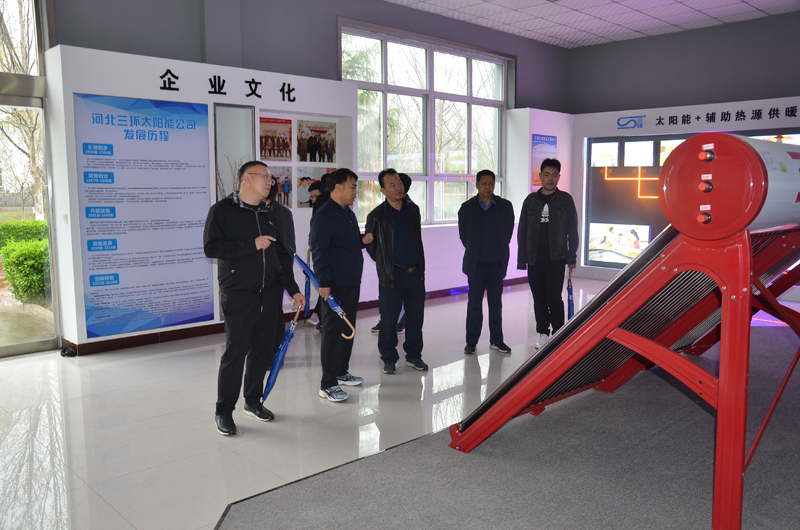 石家莊市雙代辦領導在我市雙代辦主任張利海的陪同下蒞臨我三環公司,考察太陽能采暖模式。我公司張董事長及副總經理趙東平全程陪同。我河北三環公司所開發的太陽能+電輔助及太陽能+壁掛爐采暖系統受到眾領導一致好評!